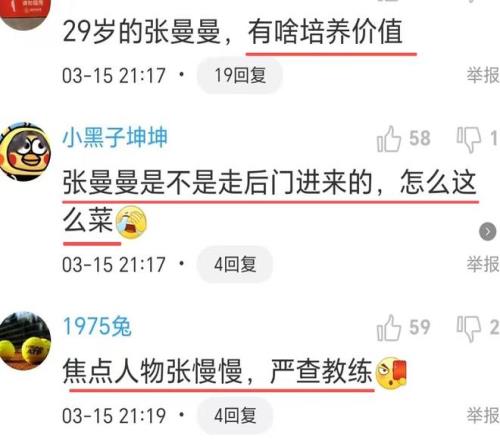 在众多新人中,表现最糟糕的就是控卫张曼曼,继一场5中1后,昨晚又是5中1,还有3次失误,没突破,没篮子,只有失误和0罚球。这个张曼曼真是看了让人崩溃,场场拉稀,队友失误在那儿一脸不爽,也不积极回防,自己辣眼失误,一脸无辜,谁给的自信?球迷说,“我一个外行人,觉得张慢慢运球的动作都不熟练,也没蓝,防守搏命抢断,这种后卫怎么出去打强队?”,“这场比赛差点给张曼曼毁了”。