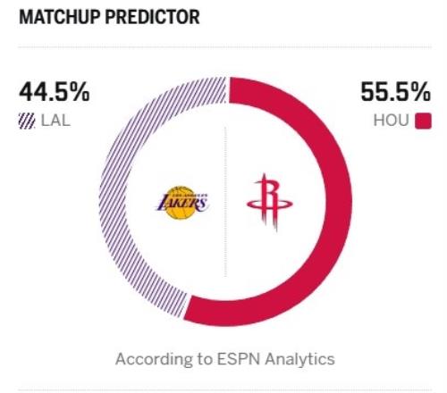 关键卡位战!ESPN明日胜率预测:火箭55.5%稍占上风湖人为44.5%